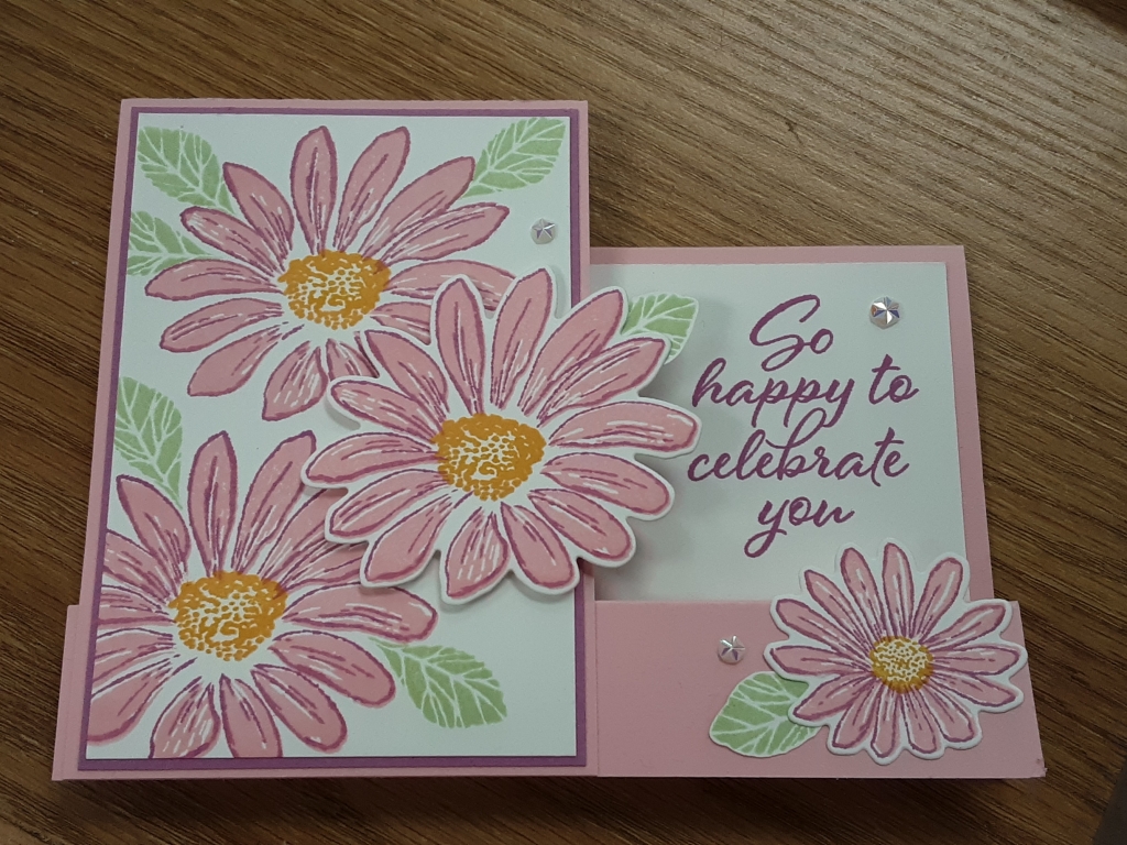 With Stampin’ Dimensionals, I added the larger daisy. I glued the smaller daisy above it with the lower edge slightly tucked under the petals of the larger flower.