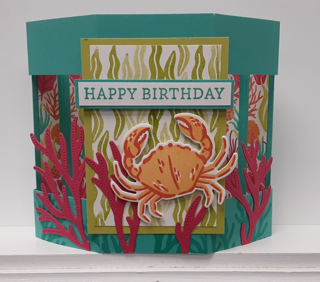 I adhered the seaweed strands to my focal panel on the left side. I adhered the crab using Stampin’ Dimensionals. I added my sentiment with Stampin’ Dimensionals to the lower right-hand corner of the card. For a bit of bling that I thought resembled bubbles, I added three Rhinestones.