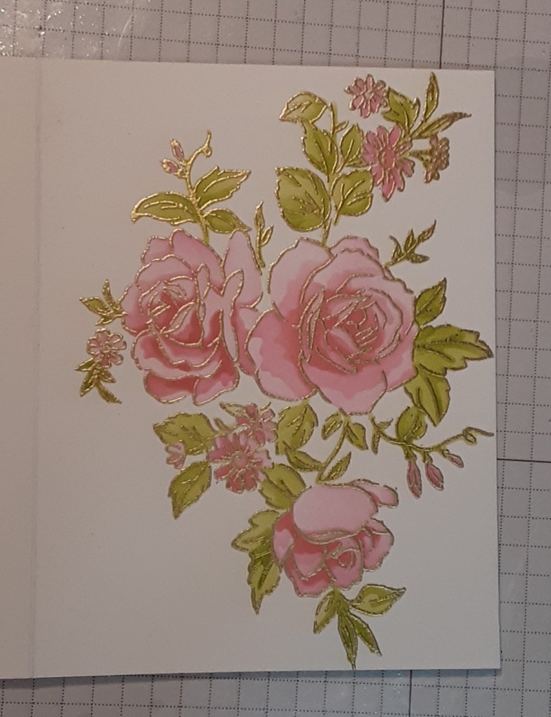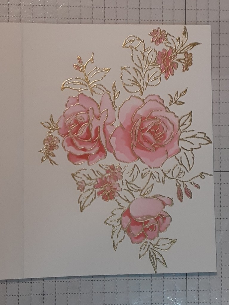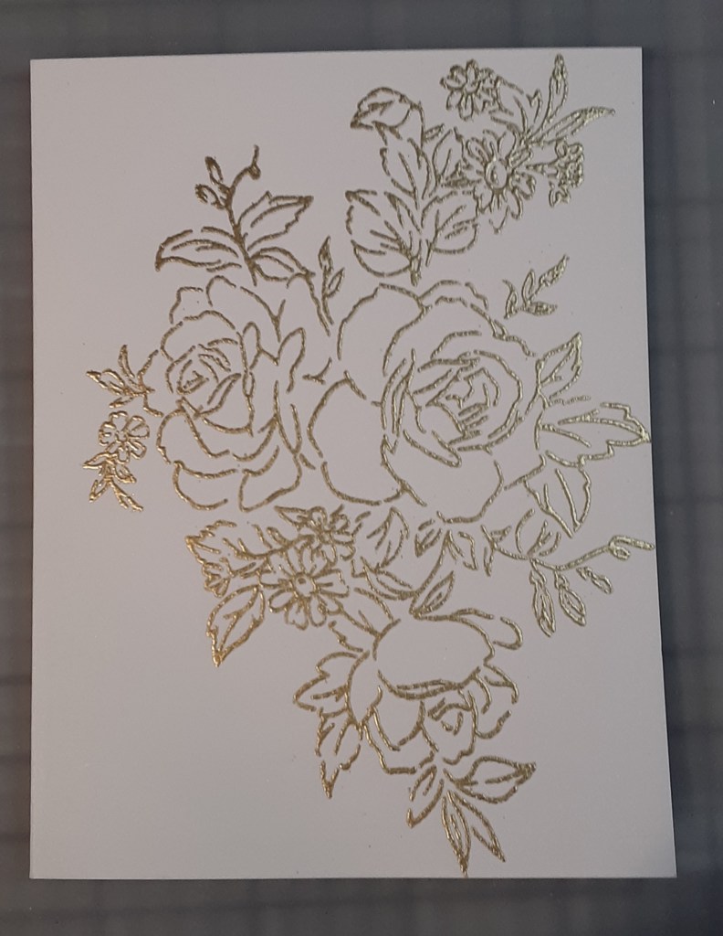 To begin, I stamped the large floral image from Layers of Beauty bundle with Versamark ink along the right edge of my card front after putting down some anti-static powder. This stamp has a lot of detail, and the anti-static powder will preserve these details. I sprinkled on Gold Embossing Powder and heat set it with my Heat Tool.