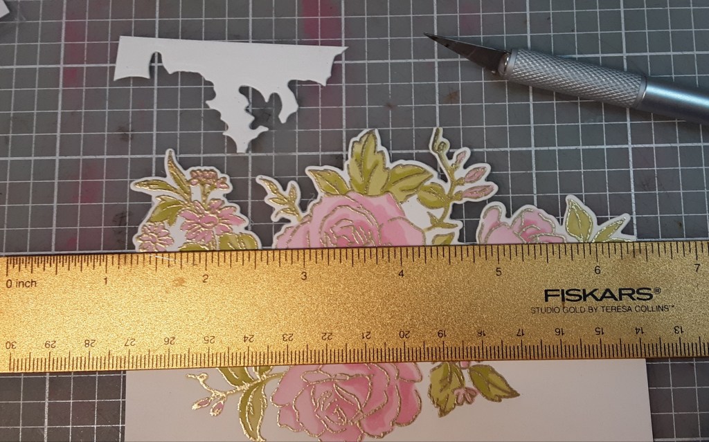 Since I didn’t cut out the entire image, there were spots that weren’t released by the die cutting. To remedy this, I used a straight edge ruler and an Exacto knife to free these spots. I used a self-healing mat to cut on. The grid lines helped me position the ruler at 1-1/4″. You could use your Paper Trimmer for this if you’re careful not to cut into the image. Some spots are very narrow and would be difficult to see under the blade.