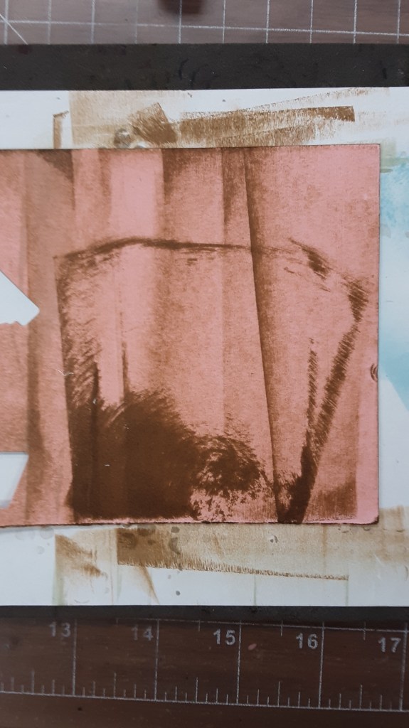 For the birdhouse itself, you could use the Country Woods DSP, but I decided I wanted a pink birdhouse. With a piece of Pretty in Pink cardstock (I used a piece 4-1/4″ x 11″), I dragged the upper edge of my Pecan Pie ink pad on the cardstock. This is called the direct to paper method. You want a firm grip on the ink pad and the paper. The foam has a tendency to grab the paper. This is what happens (or worse) when the ink pad decides to grab: