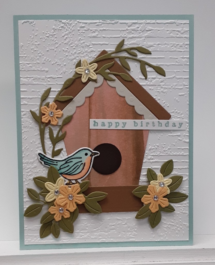 I glued my embossed panel to my card base and then glued the birdhouse to the panel about an inch from the bottom. I glued my Old Olive leaf sprays together to create an arch. I glued this to my card with the bottom close to the perch and the top extending over the roof of the birdhouse. I glued my bird on the perch to the left. The bird’s tail covered the end of the spray.
