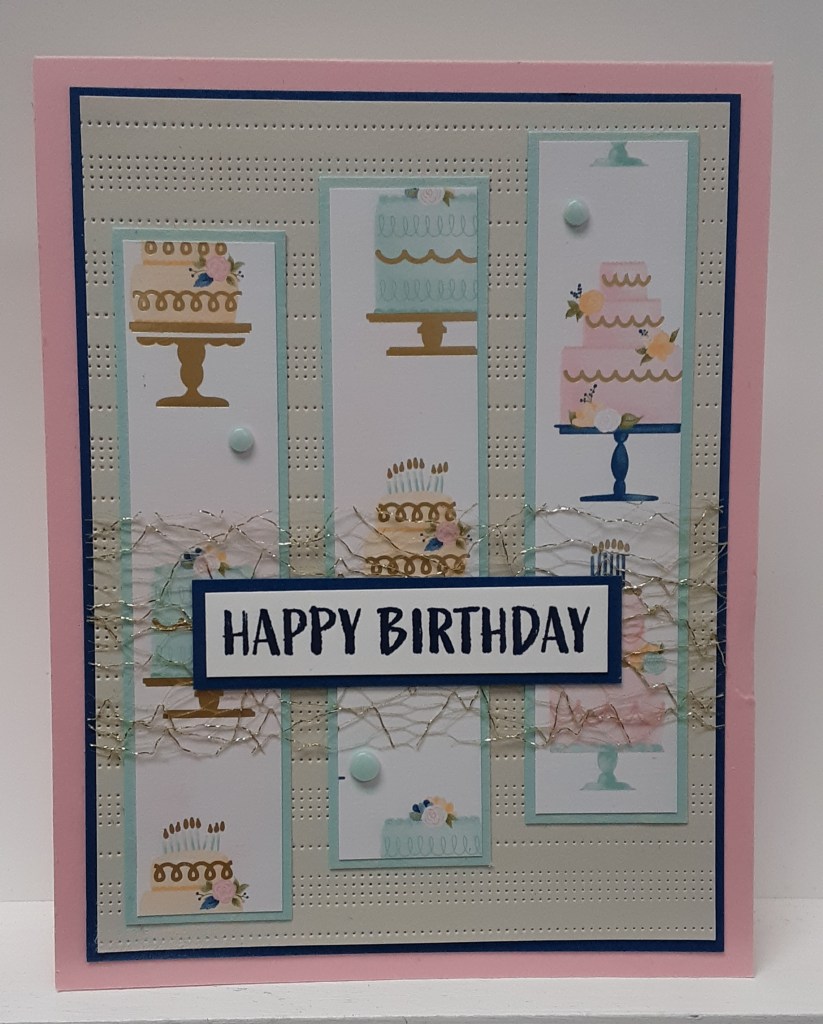 For the card base, I cut a piece of Pretty in Pink cardstock to 4-1/4″ x 11″ on my Paper Trimmer, scored and folded at 5-1/2″, and burnished with my Bone Folder. I cut a piece of Blueberry Bushel cardstock to 3-7/8″ x 5-1/8″. I cut a piece of Basic Biege cardstock to 3-3/4″ x 5″. I ran this piece through my Stampin’ Cut & Emboss Machine with my Pattern of Friendship die. This die is a cover plate (6″ x 6″) and cuts a pattern into the cardstock. I cut mine so the lines went horizontally. I cut three pieces of Pool Party cardstock to 1″ x 4-1/8″. Finally, I cut three pieces of Wildflower Birthday DSP to 7/8″ x 4″. Keep in mind the direction of the pattern when cutting these strips. Below I have an example of the pattern I used.