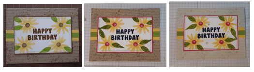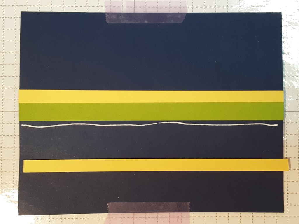 I ran a line of glue near top of the strip and added the first Daffodil Delight strip. I found it easier to add the glue to my card base. I snugged the strip up next to the first strip. I repeated this for the second yellow strip.