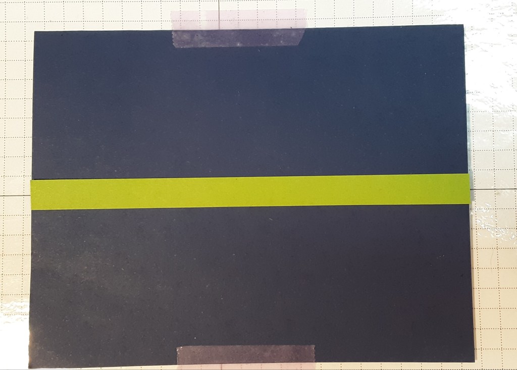 I glued the background strips on with my favorite adhesive (Multipurpose Liquid Glue or Stampin’ Seal) to my card base. To make sure they were straight I taped my card base to my grid paper with low tack tape, making sure the solid black line on the grid paper lined up with the center of my card base. I glued the Granny Apple Green strip down first, making sure it was centered.