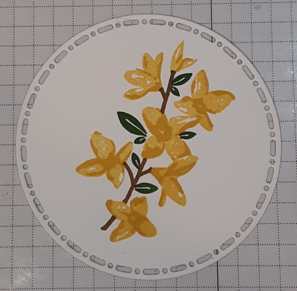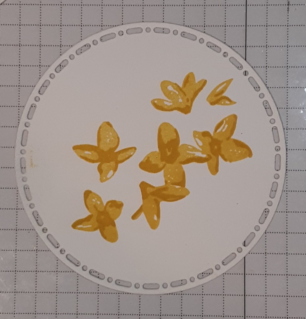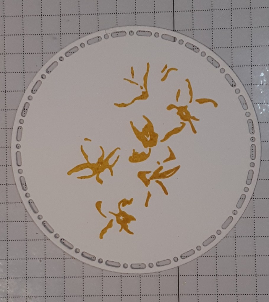 I die cut a circle from Spotlight on Nature dies in Basic White cardstock. In the middle of this circle, I stamped the detail image from Delightful Wishes stamp set in Crushed Curry ink. I find it easier to line up the lighter images once the darker image is down. It doesn’t look like much at this point.