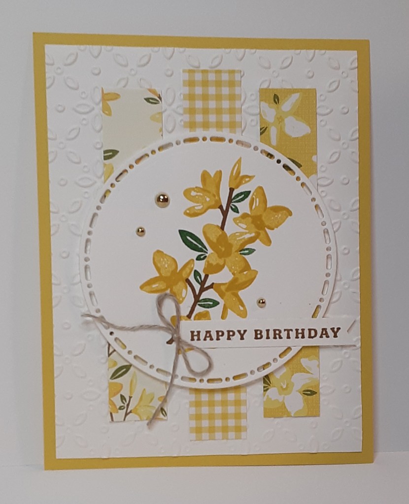 I adhered my stamped circle to the card using Stampin’ Dimensionals. I glued the sentiment towards the bottom of the circle. I tied a bow with Linen Thread and adhered it with a Mini Glue Dot. Finally, I added some gold gems from Blooming Pearls which are no longer available. I bought a substitute for the gold gems from my favorite hobby store.