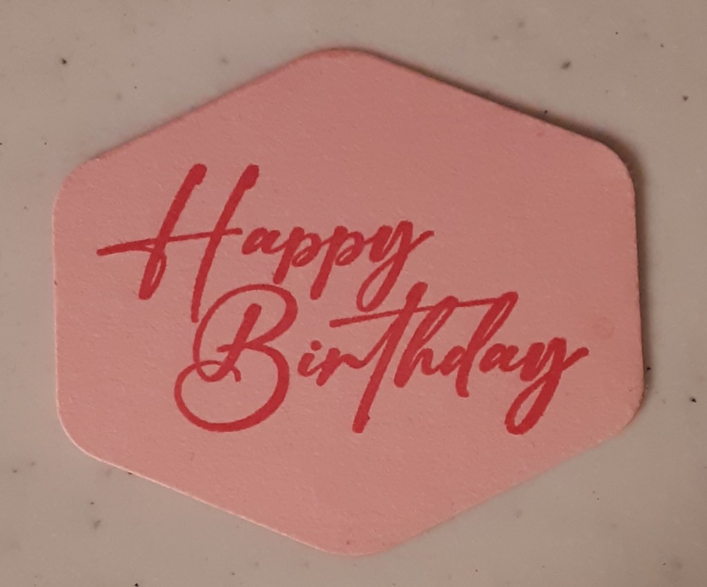 I stamped Happy Birthday on a scrap of Pretty in Pink cardstock with a retired stamp with Strawberry Slush ink. I punched the sentiment out with my Heartfelt Hexagon Punch. A good substitute would be the Happy Birthday from Unbounded Love stamp set (see below). It fills the space created by the punch quite nicely.