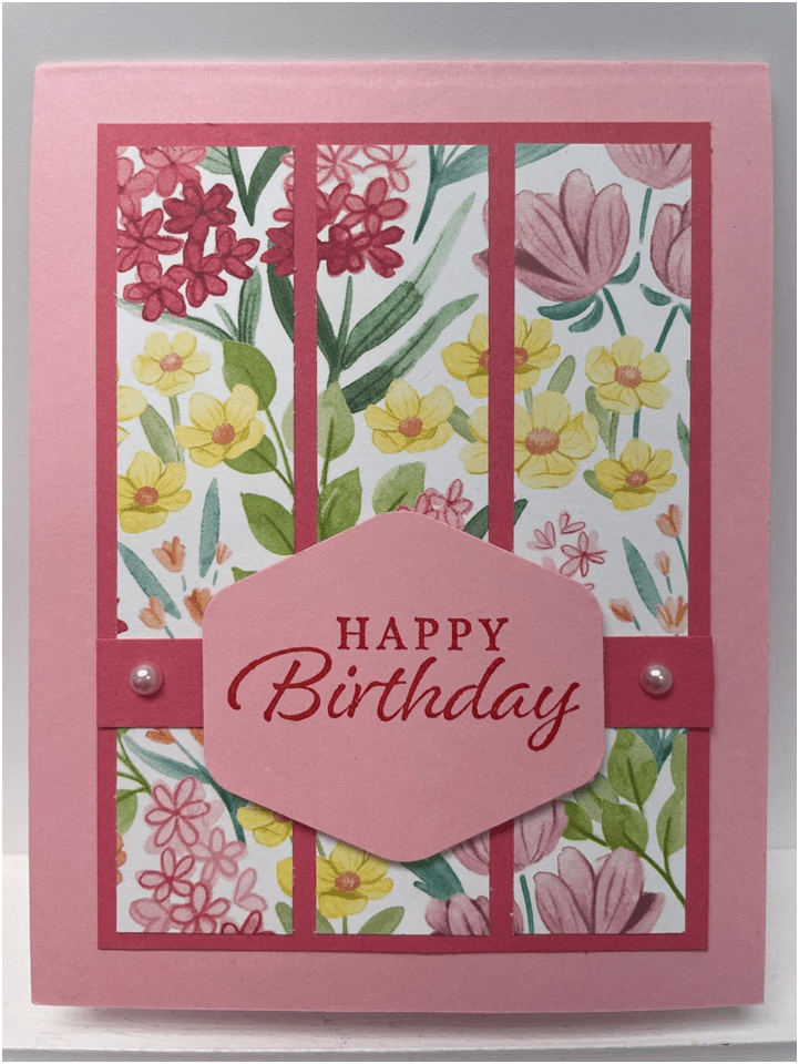 To create the card base, I cut a piece of Pretty in Pink cardstock to 8*1/2″ x 5-1/2″ on my Paper Trimmer, scored and folded at 4-1/4″, and burnished with my Bone Folder. I cut a piece of Strawberry Slush cardstock to 3-1/2″ x 4-3/4″ to act as a matte. I also cut a piece to 1/2″ x 3-1/2″ I cut a piece of Florals in Bloom DSP to 3″ x 4-1/2″ and then cut this into three strips, each 1″ wide.