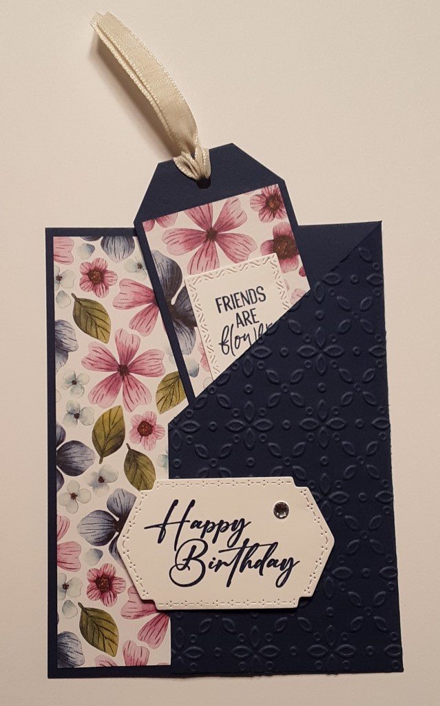 I stamped Happy Birthday from Unbounded Love Stamp Set with Night of Navy ink on a scrap of Basic White cardstock. I die cut this with the 1-3/8″ x 2-3/4″ rectangle die from Textured Notes dies. I also stamped Friends are flowers… from You Are Remarkable Stamp Set with Night of Navy ink on another scrap of Basic White cardstock. I die cut this with Mixed Labels dies.
