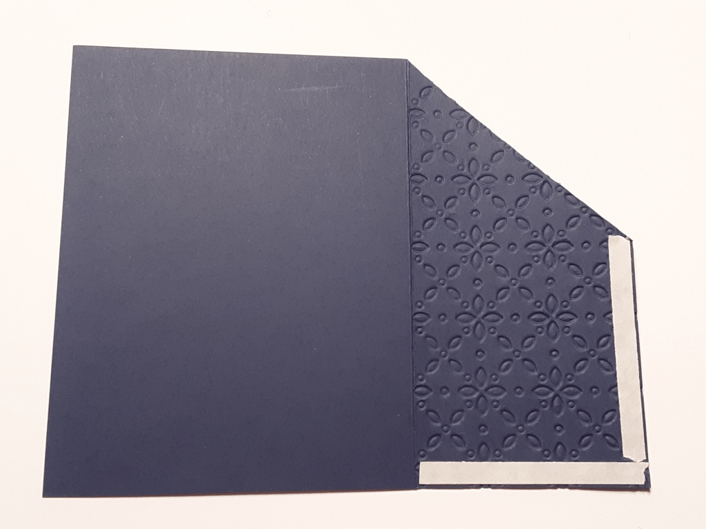 I adhered the larger piece to my card base on the left side with my favorite adhesive (Multipurpose Liquid Glue or Stampin’ Seal) leaving a 1/8″ border top, bottom, and left side.