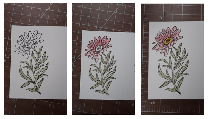 I stamped the flower from the You Are Remarkable stamp set on Basic White cardstock with Momento Tuxedo Black ink two times. I stamped the leaves and stem with Soft Sea Foam ink. Then, I stamped the petals with Pretty in Pink ink. Finally, I stamped the flower center with Daffodil Delight ink.