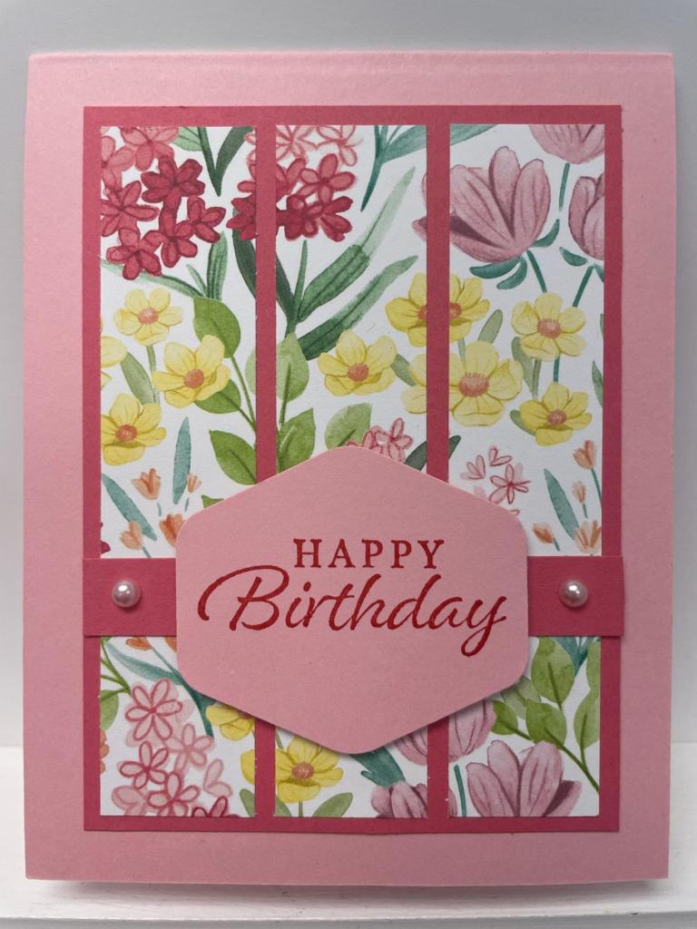 To make the card base, I cut a piece of Pretty in Pink cardstock on my Paper Trimmer, scored and folded at 5-1/2″, and burnished with my Bone Folder. I cut an additional piece to 2-1/8″ x 2-7/8″. I cut a piece of Strawberry Slush cardstock to 3-1/2″ x 4-3/4″. I cut three strips from the Florals in Bloom DSP pack to 1″ x 4-1/2″.