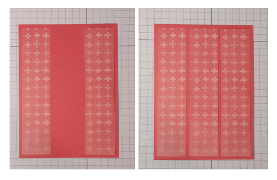 I glued my DSP strips to my Strawberry Slush matte using my favorite adhesive (Multipurpose Liquid Glue or Stampin’ Seal). I was careful with the direction of the pattern, but I wasn’t as concerned about getting them in a particular order. I started with the two outside pieces before adding the center piece, making sure it was centered. I glued this panel to my card base.