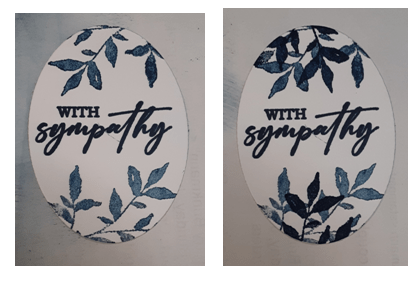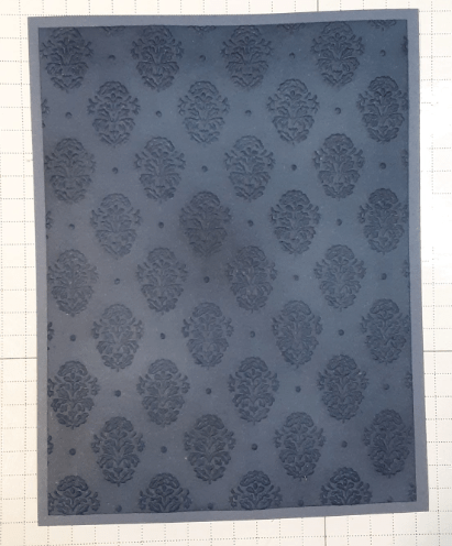 Next, I used a Blending Brush to add color (Misty Moonlight) to my damask embossed background. The ink really accentuates the embossed images. Below is a comparison with and without the ink blending. You can barely see the embossing on the first one.