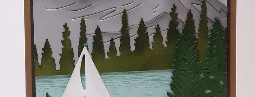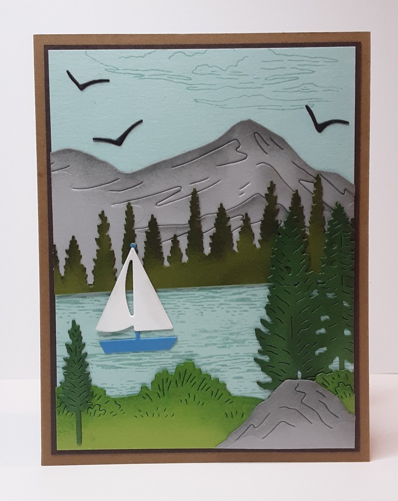 Today’s card features the Scenic Adventure bundle. I’ve had it a couple of weeks and couldn’t wait to use it. It takes some playing with to get the scene you want to build. I combined it with the Sunrise Sailing bundle. I thought it would be so pleasant to sail on the water, so I had to add the sailboat.