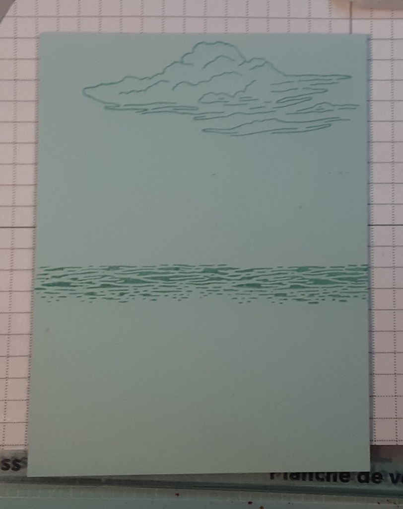 To prepare the background, I stamped the clouds from Scenic Adventure bundle with Pool Party ink at the top of my Pool Party piece. I stamped the water stamp where I thought my water line would be. I had to stamp it twice to make it fit all the way across.