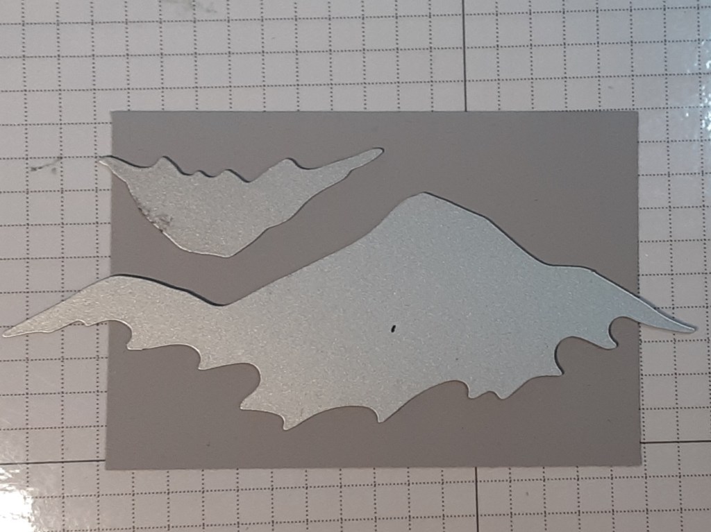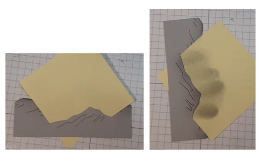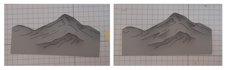 I added Smoky Slate ink to my mountain range. I tapped off the excess ink so that I wouldn’t get a blob at the top of my mountain. I blended the ink along the top edge. I stuck a Post-it note in the opening created by the die to add some shading to the lower peak. Notice in the second picture that I started on the Post-it note and pushed the brush down toward the peak. Be careful by the edges so that you don’t accidentally make an inky line along the edge of the Post-it note. (Ask me how I know this!)