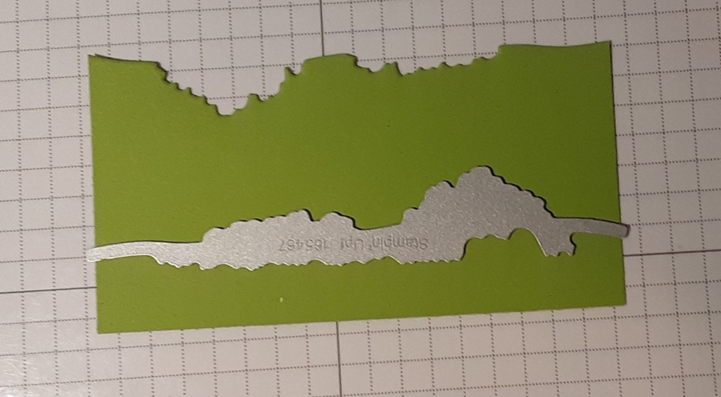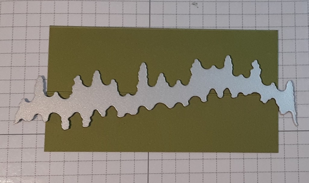 I die cut the tree line from a 4″ wide piece of Old Olive cardstock. When positioning the die on the cardstock, be aware of the direction the trees are going. They are also on a slant, so try to put the die so the trees are parallel to the edge of the cardstock.