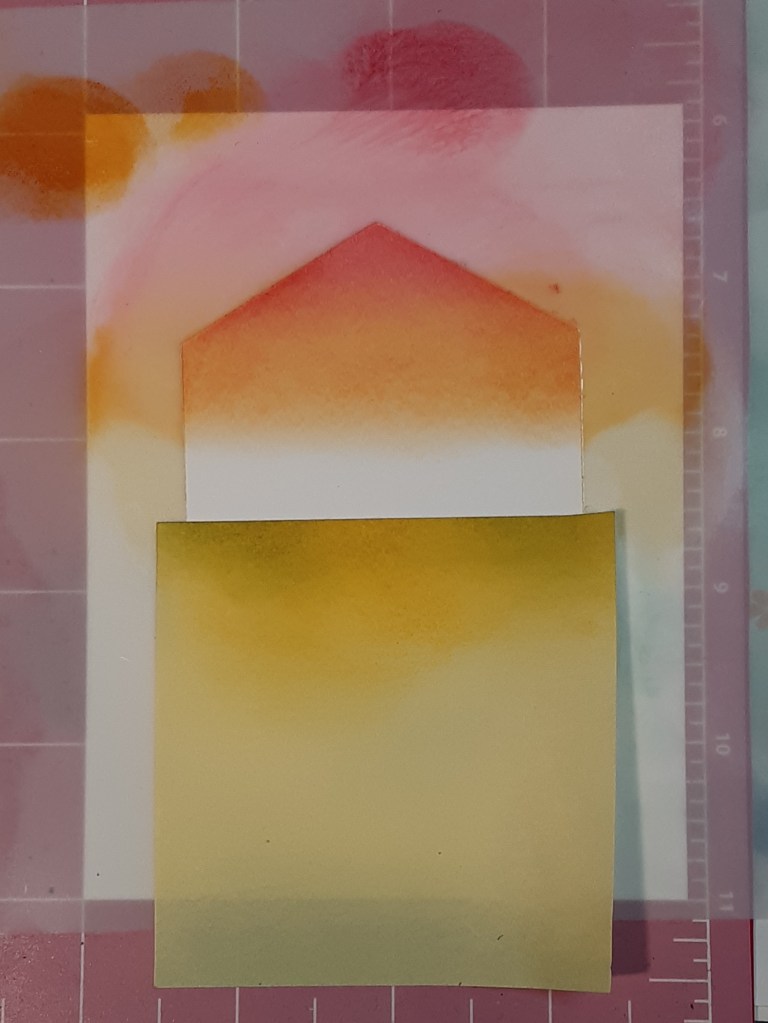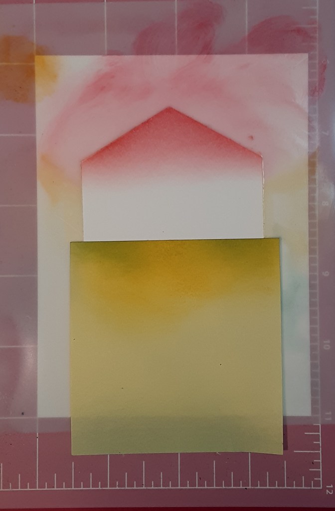 I stuck my white piece on a sticky mat. I made my sticky mat from a Cricut mat that I cut down to a more convenient size. The handmade stencil sticks to the sticky mat and secures it while I ink blend. I put a post-it note where I wanted my water line to be. Starting at the top, I ink blended with a Small Blending Brush in Strawberry Slush ink. In the picture you can see where I tapped off the ink before blending it on with a LIGHT hand. I could pick up more color if I needed it. I make multiple cards, and this was not my first attempt as you can tell by the various ink smudges on the stencil.