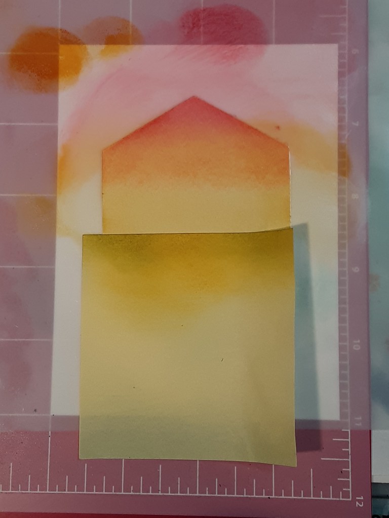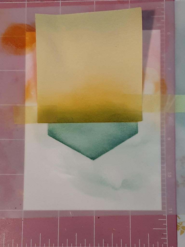 I removed the post-it note to work on the water. Because I was impatient and couldn’t wait for the previous inks to dry, I needed to secure the post-it note with some yellow Easy-See tape (Amazon). I used Lost Lagoon ink for the water. I pulled the stencil off the sticky mat with no problem. To keep from tearing your ink-blended piece, bend the sticky mat back away from the paper. This helps minimize the surface area that is sticking to the mat, and it is easier to remove the paper.