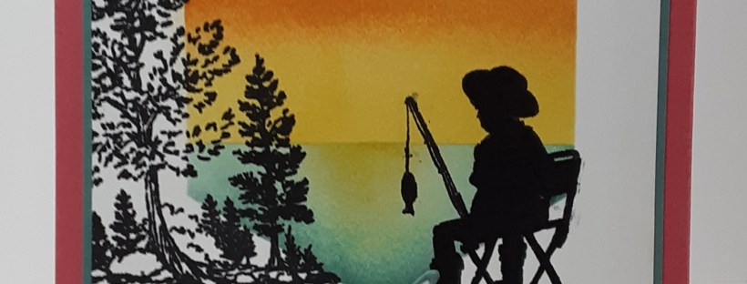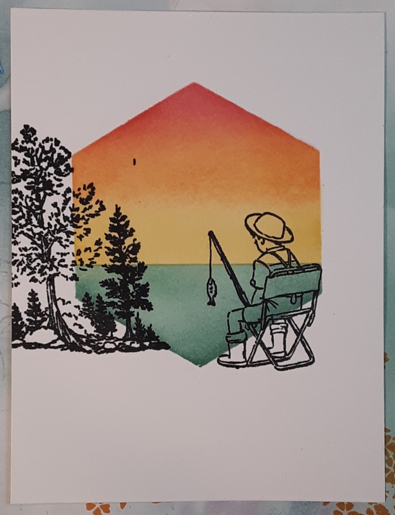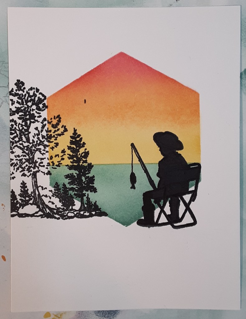 I stamped the boy fishing and the trees from Peaceful Pier stamp set onto my focal layer with Momento Tuxedo Black ink. I did use my MISTI stamp positioner to repeat stamp the tree image to make it a solid black.