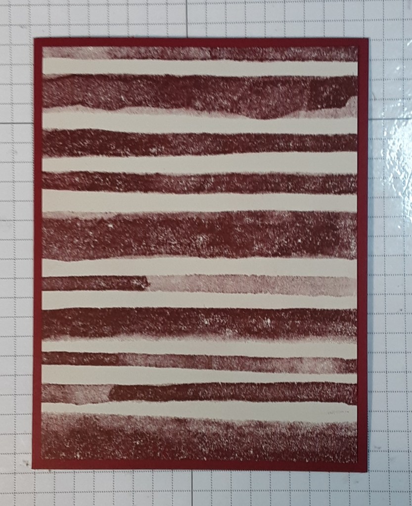 I stamped Painted Stripes stamp set in Cherry Cobbler ink on the Basic Beige piece. This stamp was designed so that the ink doesn’t stamp evenly, so the stripes have a variegated look. I adhered this panel to my card base with my favorite adhesive (Multipurpose Liquid Glue or Stampin’ Seal).
