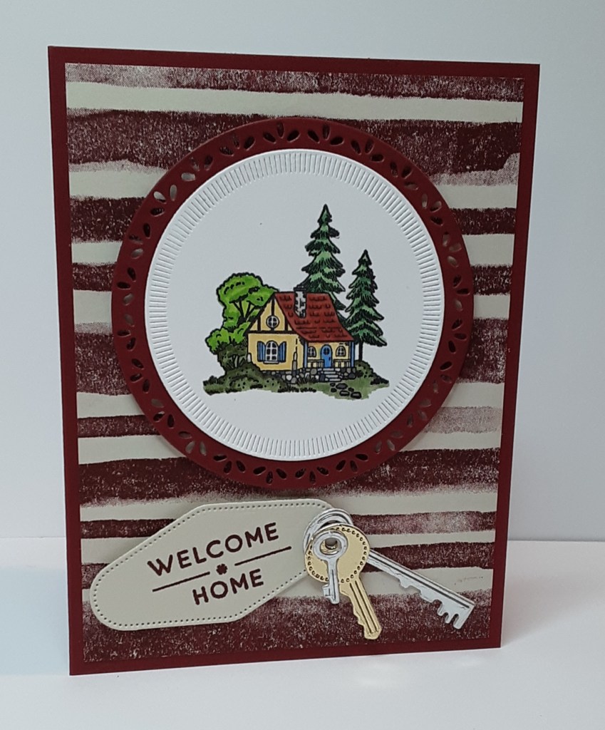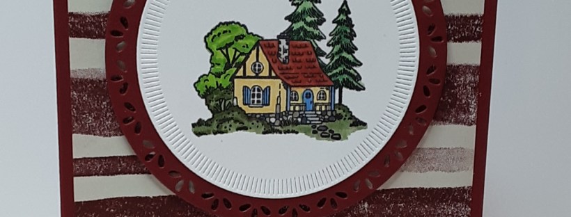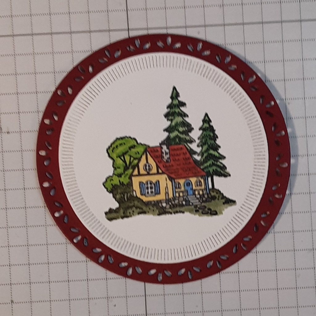 I stamped the house from Framed Scenes stamp set in Momento Tuxedo Black ink on Basic White cardstock. I made sure to give myself enough room to cut the image out with my Spotlight on Nature dies, the 2¾” circle on my Stampin’ Cut & Emboss Machine. I also cut out the 3¾” circle from Cherry Cobbler cardstock.