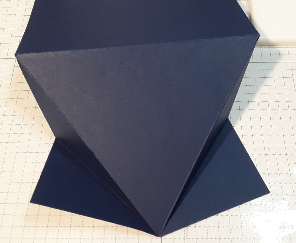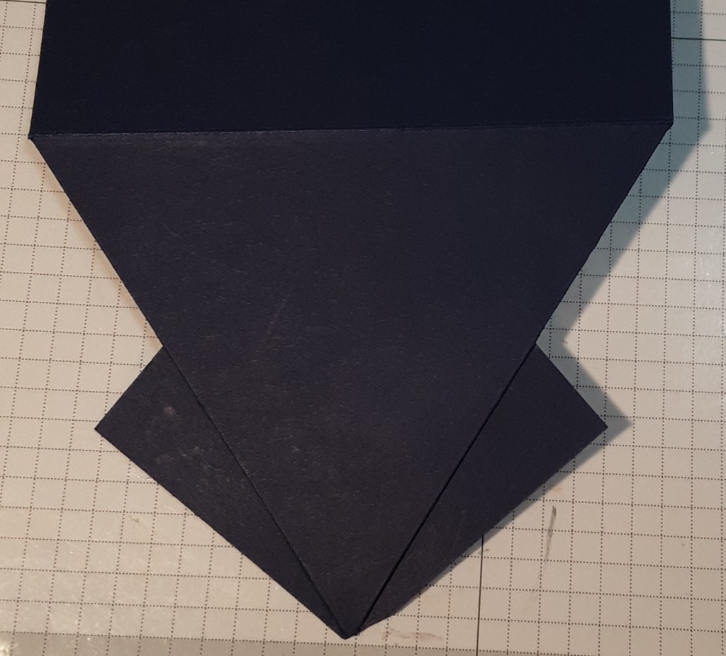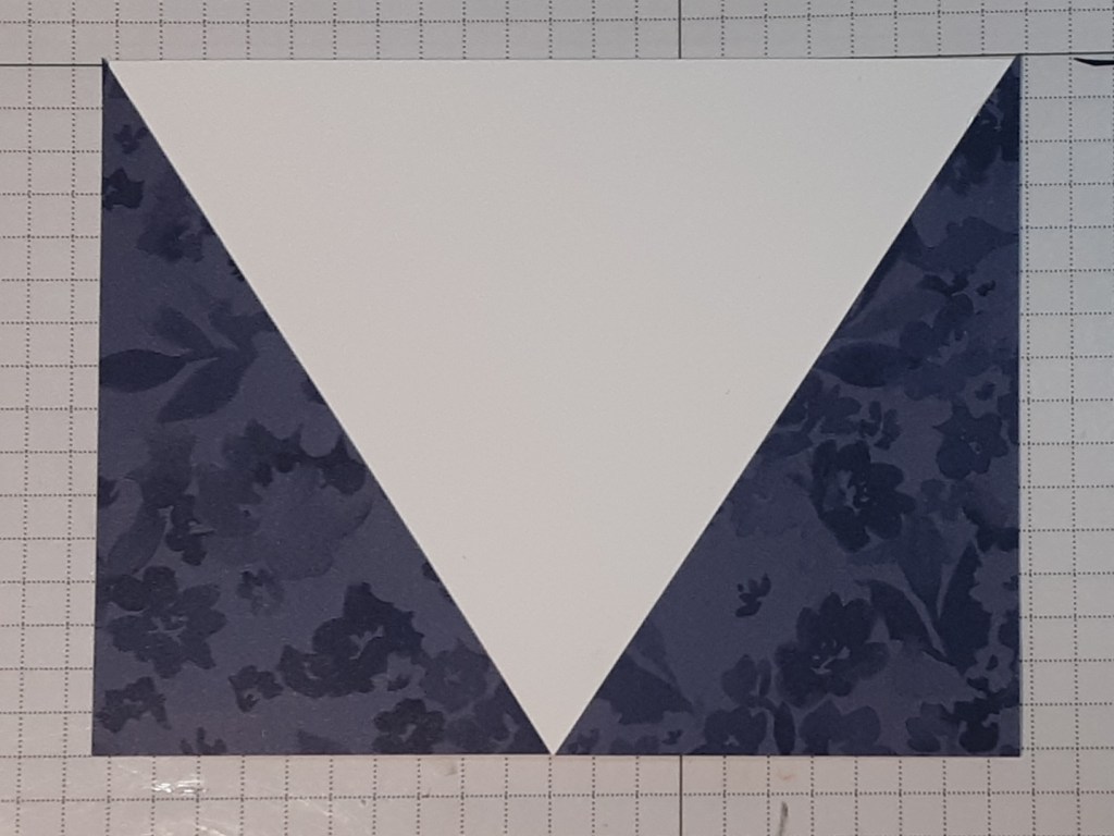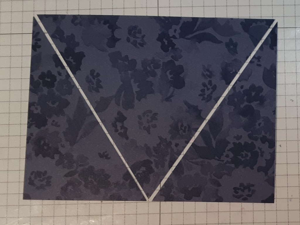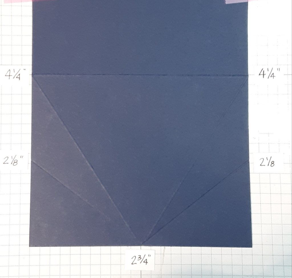 On the blue side, I marked the bottom center at 2⅝” with a pencil. I lined the upper corner with my pencil mark in my trimmer and cut diagonally from the corner to the pencil mark.