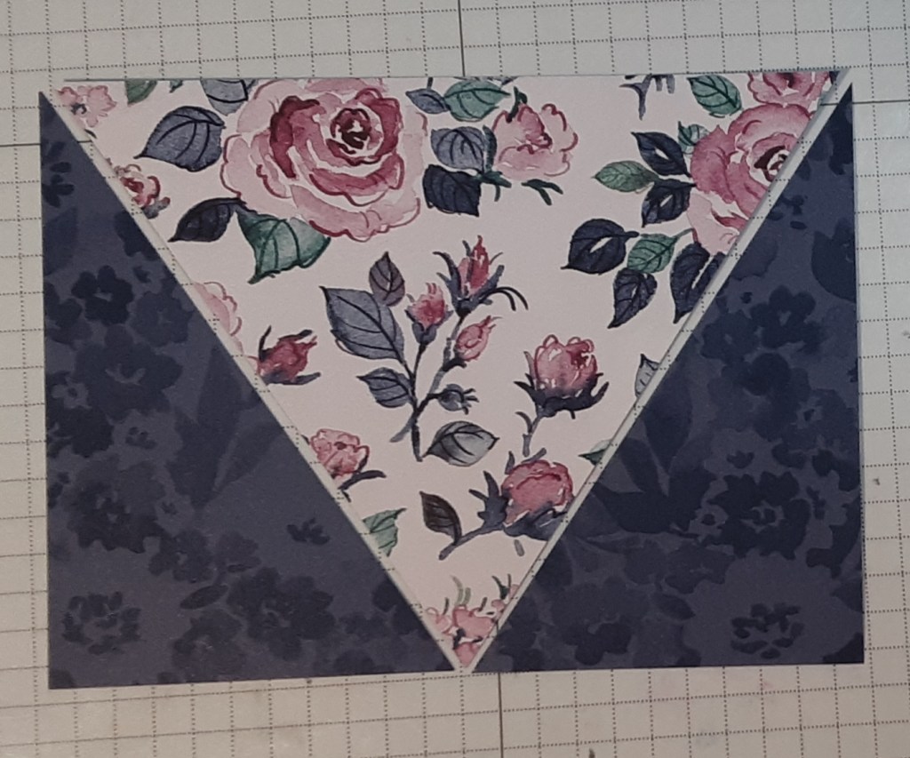 I cut a piece of Floral Charm DSP to 4” x 5¼”. I chose the floral design with the Night of Navy design on the back. Be cognizant of the direction of the design before cutting. I used the piece in a landscape position.