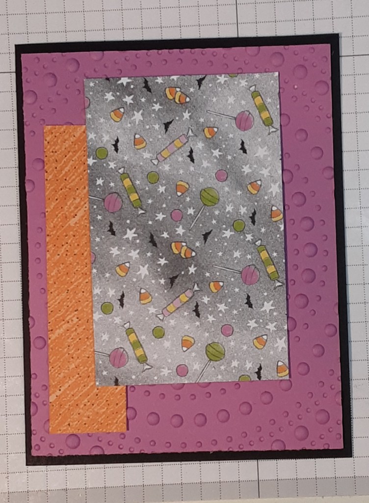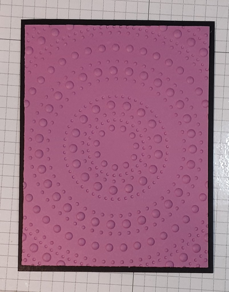 To make the card base, I cut a piece of Basic Black cardstock to 5½” x 8½” on my Paper Trimmer, scored and folded at 4¼”, and burnished with my Bone Folder. I cut a piece of Petunia Pop cardstock to 4” x 5¼”. I ran this piece through the Dotted Circles Embossing Folder on my Stampin’ Cut & Emboss Machine, centering my cardstock in the embossing folder. With the Spooky Sweet DSP, I cut a piece 1″ x 4″ and another to 2½” x 4″.