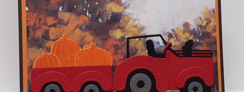 It’s finally fall! This week we are finally experiencing the cooler evening temperatures here in southwest Ohio. The days are getting shorter and soon the leaves should begin to change. The walnut trees by my driveway are shedding their nuts and the squirrels are busy collecting them. Fall reminds me of the Halloween weekend campouts with the kids. We participated in nature scavenger hunts and hayrides. This card reminds me of the tractor pulling us around the campground. So much fun! Marilyn here with another card.