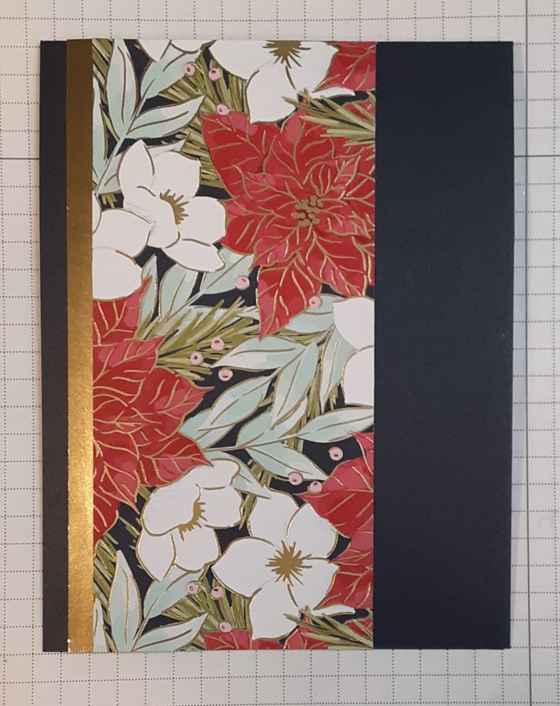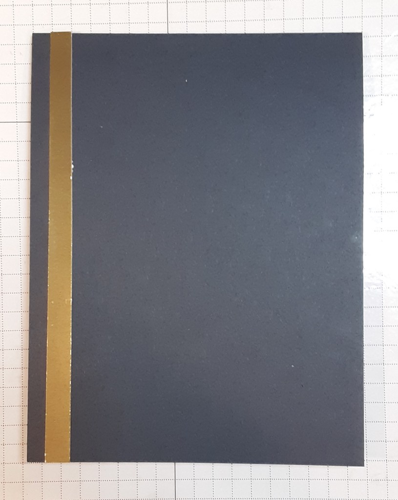 I added my gold strip to my card base with my favorite adhesive (Multipurpose Liquid Glue or Stampin’ Seal). I used my Grid Paper to line up the strip ¼” from the left edge of my card.