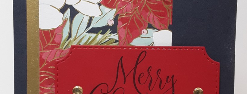 I cut a strip of Gold Foil Sheets to ¼” x 5½”. I stamped Merry Christmas from Ornamental Christmas stamp set in Secret Sea ink on a piece of Real Red cardstock. I die cut this with the Branching Out dies on my Stampin’ Cut & Emboss Machine.
