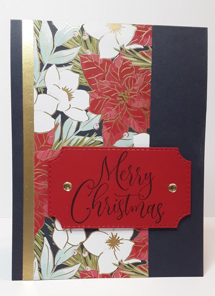 It’s Simple Saturday and I have a quick and easy card. The DSP does all the work! You could step it up by adding dry embossing to the card base or add a few additional embellishments. This is a great card for mass producing. With Christmas just two months away, it is time to think about Christmas cards! If you came to Terry’s most recent class, you had the opportunity to make this card.