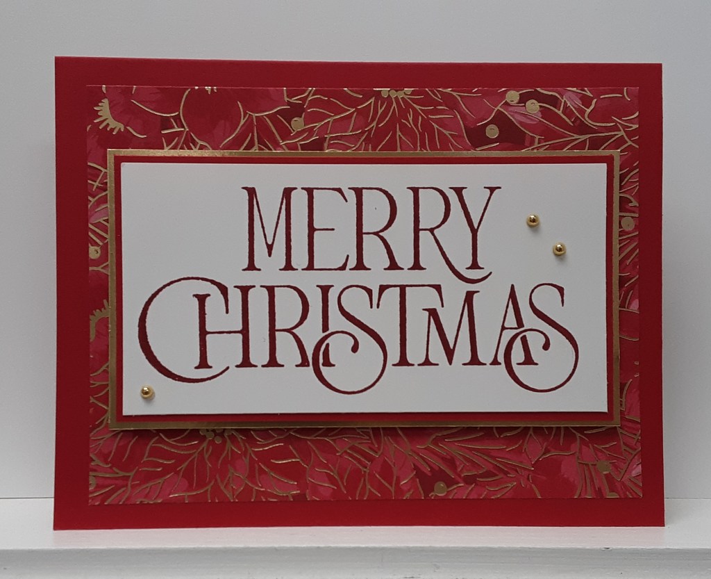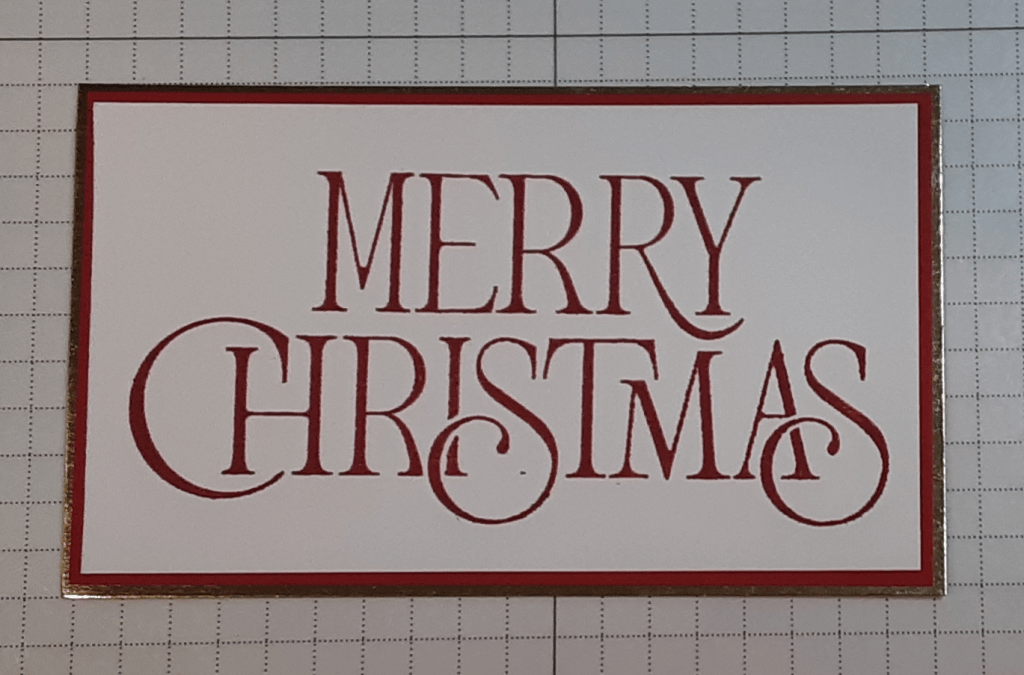 I cut a piece of Gold Foil Sheets to 4⅝” x 2¾”. I cut a piece of Basic White cardstock to 4⅜” x 2½”. On the white piece I stamped Merry Christmas from the Merry Christmas stamp set in Real Red ink.