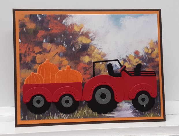 With Halloween in the rearview mirror, we are rapidly approaching the whirl of the holiday season. With less than a month between Thanksgiving and Christmas this year, time will seem to flash by. Before you know it, we’ll be in a new year. Today’s card features the Tractor & Co bundle that we used in October, but this time it has a holiday vibe. When I see this card, it reminds me of my childhood when we would take a Saturday and travel to a tree farm in Indiana to find the perfect tree. My parents made this an event by inviting other friends with families to join in the fun and then have a meal at our house. We always looked forward to it. Marilyn here with another card.