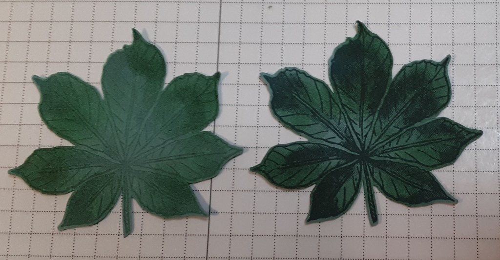 I stamped another one using Pretty Peacock ink, again on Lost Lagoon cardstock. With a Sponge Dauber, I daubed on Garden Green ink. If you blend the ink, you will smudge the lines of the leaves. I rather like the distinct lines showing.