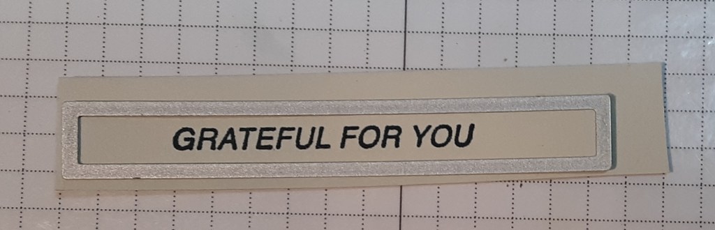 I stamped Grateful for You from Amber Autumn stamp set with Pretty Peacock ink on a scrap of Basic Beige cardstock. I used the long narrow die from Textured Notes dies to cut out my sentiment on my Stampin’ Cut & Emboss Machine. I cut the right side off at an angle with my scissors.