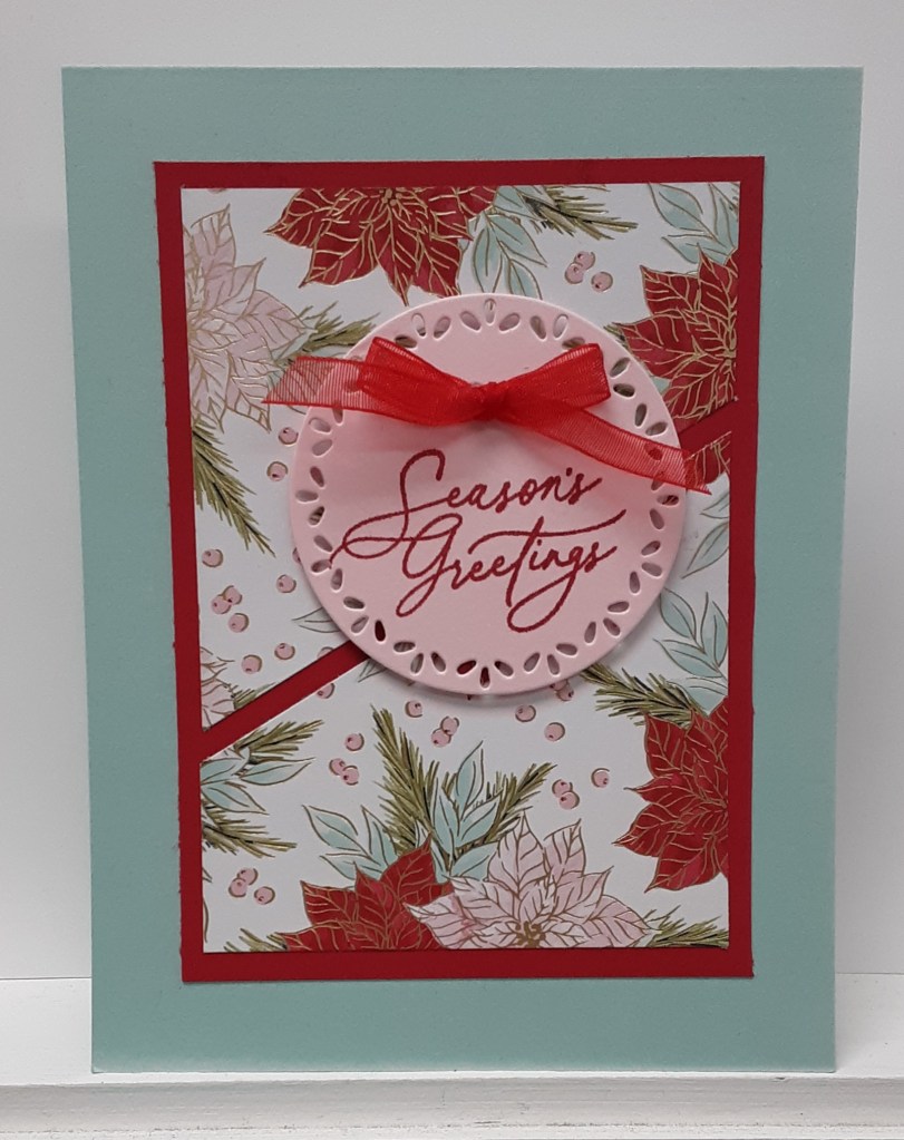 It’s Saturday and I have another simple card. Once again, I am using the gorgeous Traditions of Christmas DSP, but I am pairing it with a couple non-traditional Christmas colors plus the very traditional red. Don’t forget to check out the Last Chance product list here. Hopefully the ones I used for this project are still available.