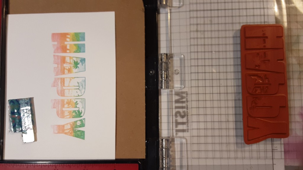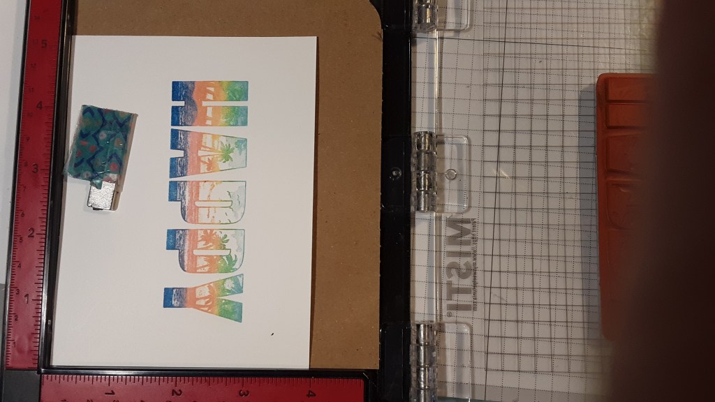Finally, I carefully applied Azure Afternoon ink to the bottom of the stamp. I didn’t want it to overlap the pink too much.