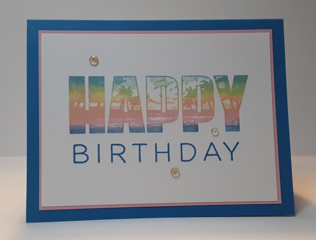 I really liked the rainbow effect the three colors created and the more intense blue at the bottom really grounded the image. I added BIRTHDAY with Azure Afternoon ink under HAPPY. You could also make this a retirement card by simply changing the sentiment. There are several to choose from.