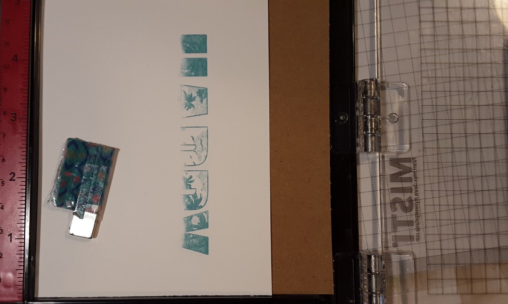 To stamp the focal point, I used the Happy Place stamp set. Thank you to Diane for lending me her stamp set! To make the stamping easier, I used my MISTI stamping platform. You can use any platform you want, but I do recommend using one. If you need to restamp a color, it makes it easier. With my cardstock in the corner of the MISTI, I mounted the stamp to the lid. I began with the top of the stamp and used a Sponge Dauber to add Balmy Blue ink. I did not cover the entire stamp, just about the top ⅜” or so.
