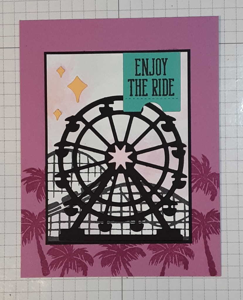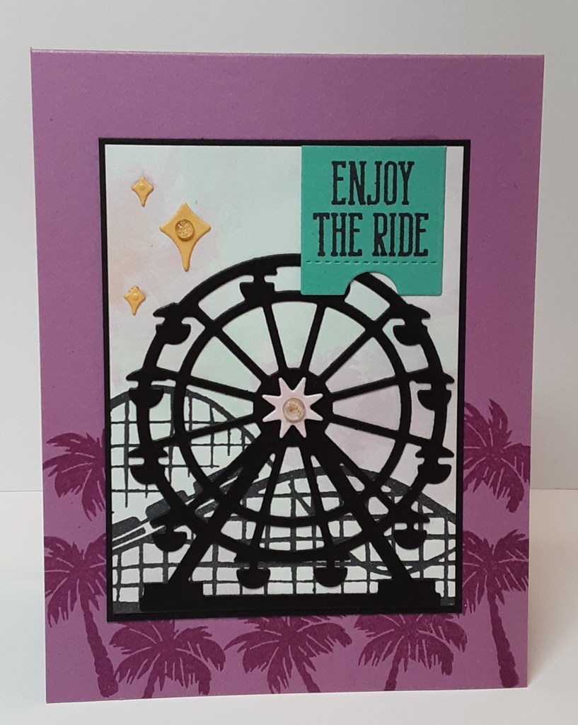 I die cut the ticket from Summer Splash cardstock and stamped Enjoy the Ride in Momento Tuxedo Black ink. I cut the sparkles from Peach Pie cardstock. I cut the ticket in half before gluing it to the card. I added the panel.