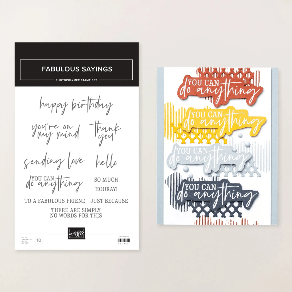 While you are shopping, keep in mind that Stampin’ Up! also has their Product of the Month special. This month they are offering the stamp set Fabulous Sayings (167972). Look below to see the versatile sayings and fun font. With a $75 purchase, you can get this set for just $5. With the $50 Bonus Days credit, a little more puts you up to $75. Two specials in one!