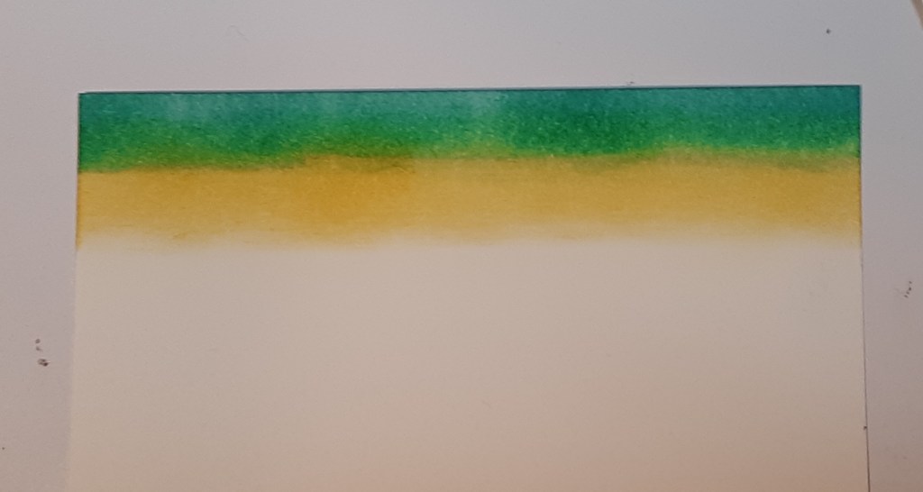 With the first piece of white cardstock, I used a Sponge Dauber to apply ink to the paper. I began with Coastal Cabana ink and made a line of ink across the 4¼” edge. I made the line about ½” wide. I added some Daffodil Delight ink under the Coastal Cabana, overlapping and blending it a little.