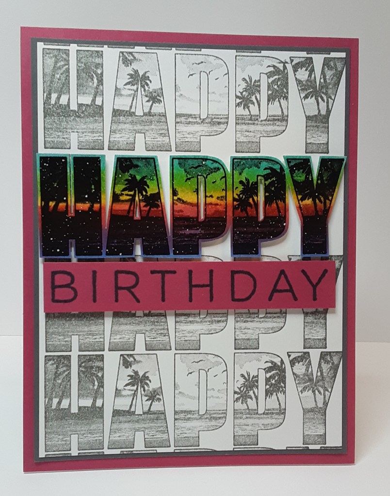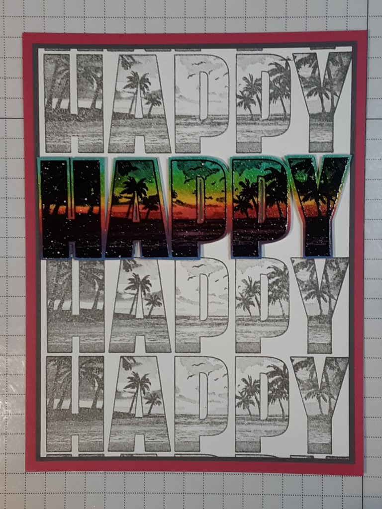I wanted to heat emboss Happy on this colorful strip. I set this aside while the ink dried. In the meantime, let me tell you what I learned. Initially, I heat embossed the stamped image with clear embossing powder from the Basics Embossing Powder pack. I used Versafine Black Onyx ink, which Stampin’ Up! carried once upon a time. This is a pigment ink that takes a little time to dry so the embossing powder likes to stick to it. The clear embossing powder sticks to the black ink and the extra bits don’t show and blur the image. You could use Versamark ink and black embossing powder, but I haven’t had any level of success with it. I always seem to manage to get the black embossing powder EVERYWHERE and it is a mess. Anyway, I applied the ink to the stamped and embossed image. Because I embossed the image first, the ink didn’t stick everywhere on the paper beneath it and the inking was subtle. There were spots that could have had color without the embossing. Here is a picture showing the comparison of embossing first versus inking first. When I inked first, the colors were more vibrant.
