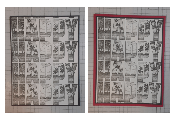 For my background panel, I repeat stamped the Happy with Smoky Slate ink on my second piece of white cardstock. I recommend using a stamping tool like the MISTI to make this easier. I positioned my paper and moved it up and down the side 1¼”. I trimmed the background down to 3⅞” x 5⅛”.