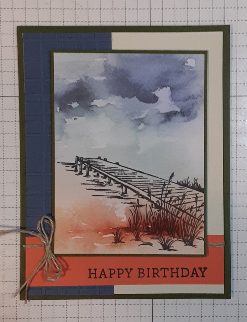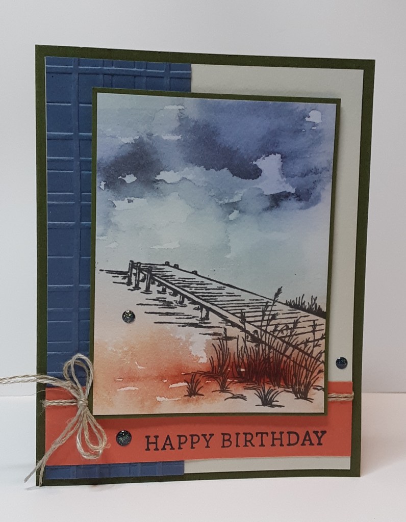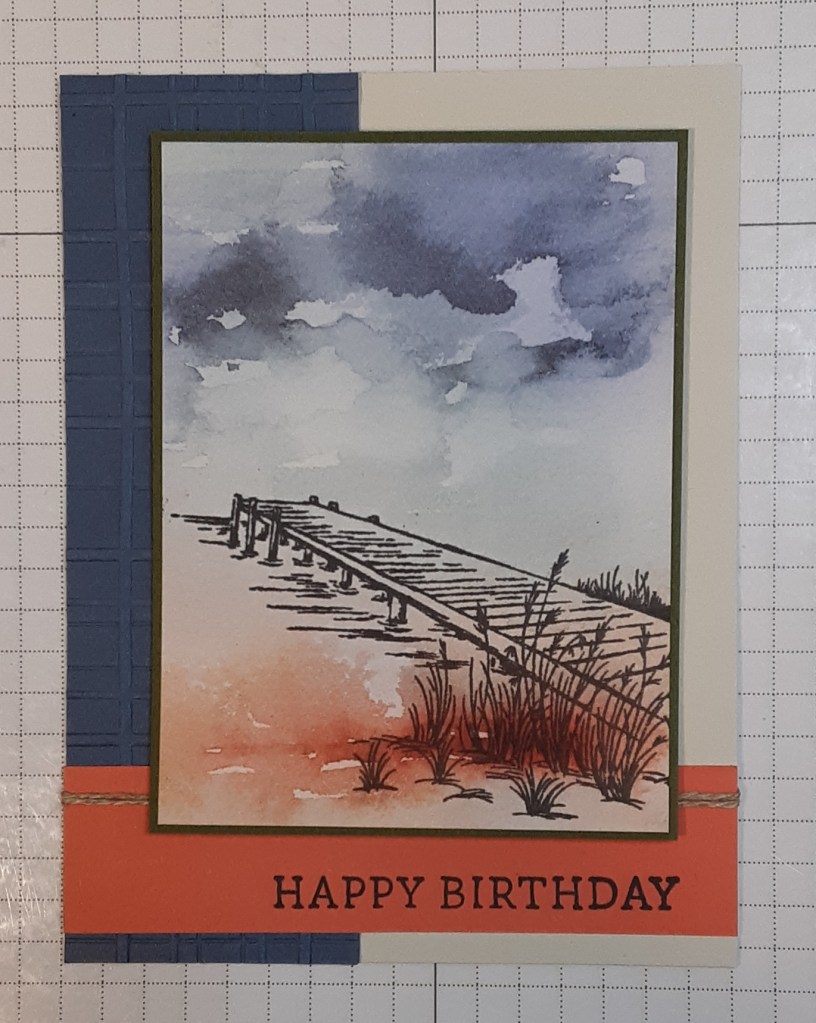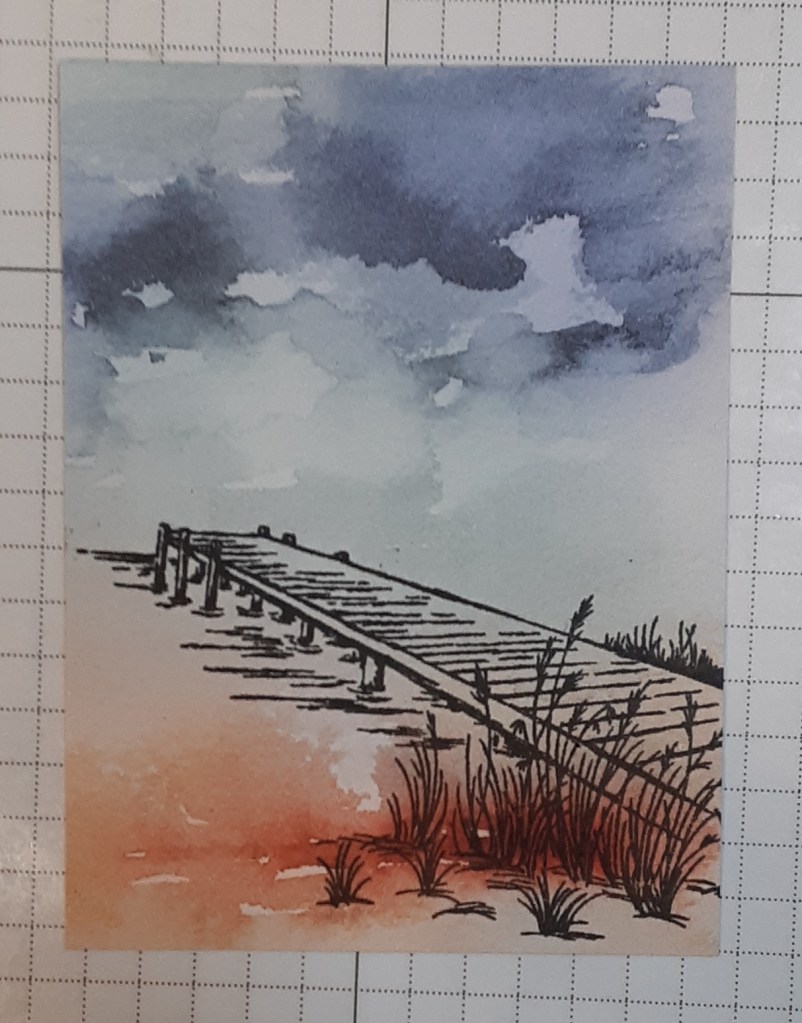 I stamped the pier from Peaceful Pier stamp set in Momento Tuxedo Black ink on my DSP. I didn’t color mine in but you could if you’d like.