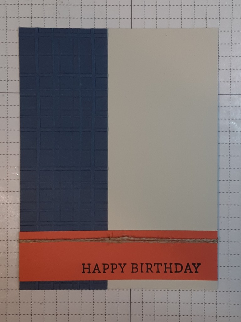 I stamped Happy Birthday from Simply Said stamp set with Momento Tuxedo Black ink in the lower right on my Calypso Coral strip. I adhered my coral piece about ¼” from the bottom of the panel. I wrapped a double strand of Linen Thread around the panel.